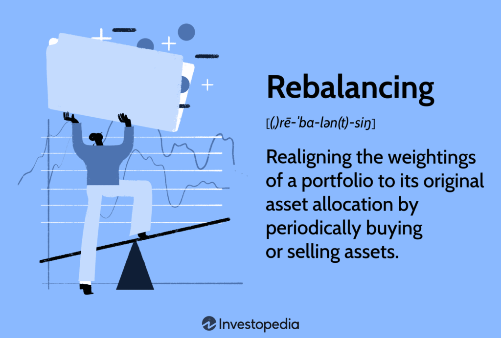 Rebalancing involves periodically restoring the portfolio to its target allocation.